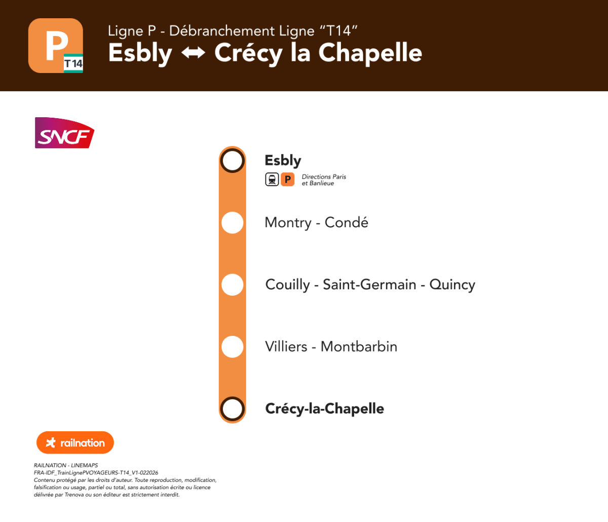 Le T14 Express assure la desserte ferroviaire de la vallée du Grand Morin, entre Esbly et Crécy‑la‑Chapelle. Il s’agit d’une ligne courte, à vocation locale, exploitée selon une logique ferroviaire et intégrée au réseau des lignes ouvertes à la concurrence en Île‑de‑France. La ligne permet des correspondances avec le Transilien P à Esbly, offrant un accès direct à Paris‑Est.